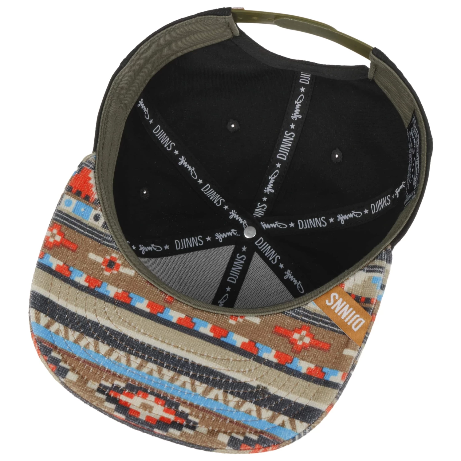 Während der Visor dieser hippen Kappe von Djinns ein Aztekenmuster zeigt, ist der Kopfteil eher dezent gehalten – von dem Lederpatch auf der Front einmal abgesehen.