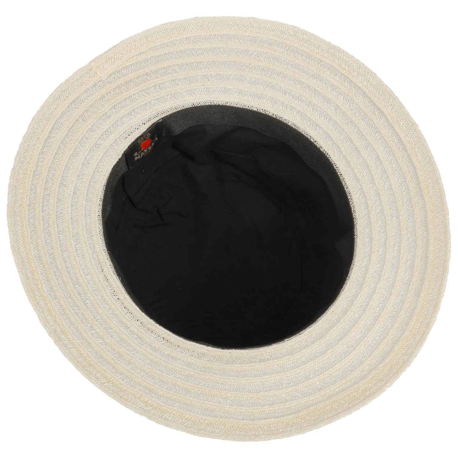 Innen schmiegt sich weiches unifarbenes Baumwollfutter an das Haupt. Die unifarbene Krone wird in harmonischer Kontrastfarbe von fein verwobenen Hanfborten umgeben, passend zu der aus selbigen Borten verarbeiteten Krempe.