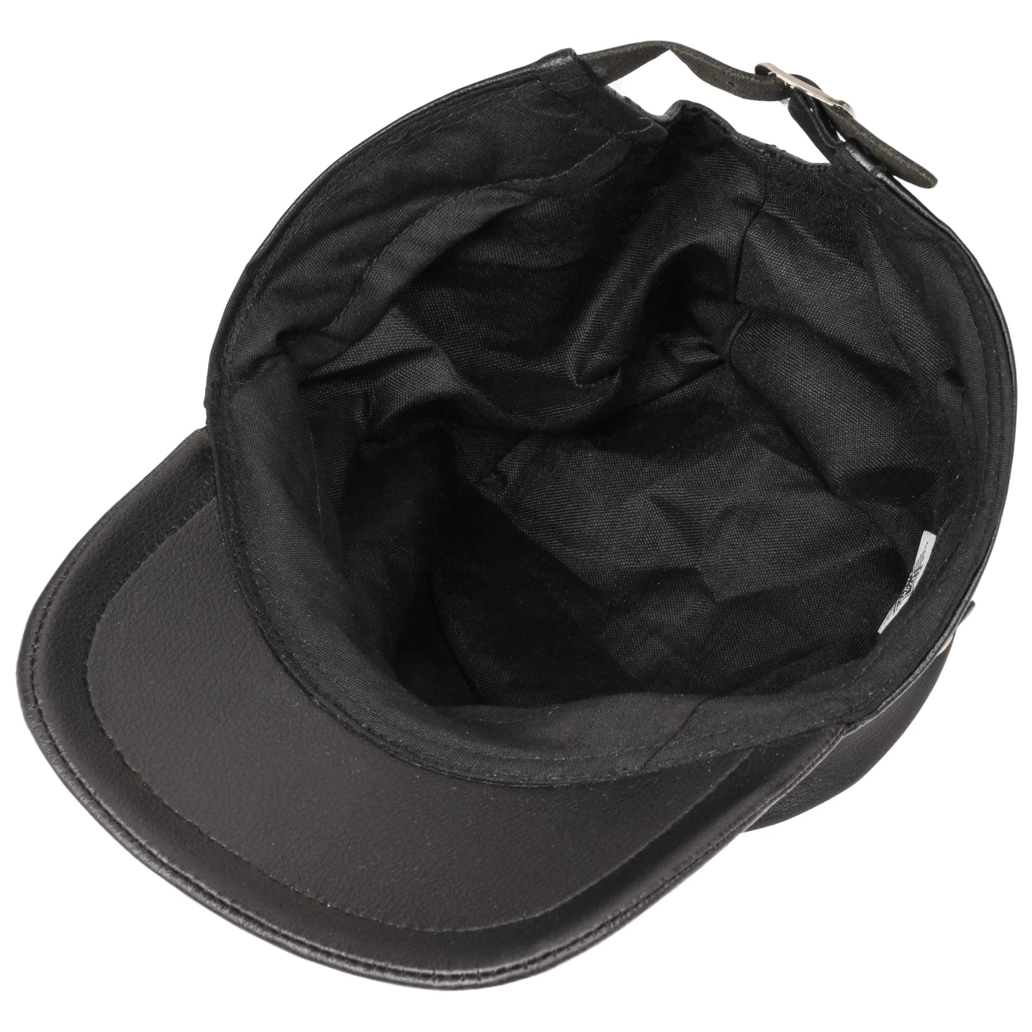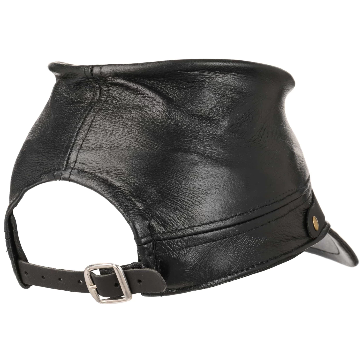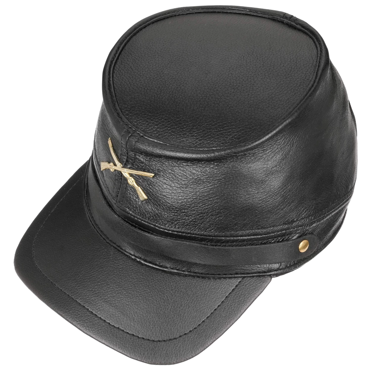 Mit gekreuzten Gewehren über dem Garniturband zeigt sich die Lederkappe authentisch und originell.