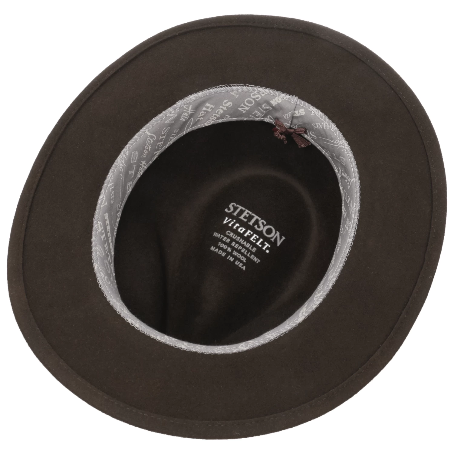 Das hochwertige VitaFelt-Material aus 100% Wollfilz schützt auch noch vor Regen und Feuchtigkeit und hält den Kopf angenehm trocken. Weltenbummler wissen außerdem zu schätzen, dass sich der Stetson klein zusammengerollt bedenkenlos in Rucksack oder Reisetasche packen lässt.