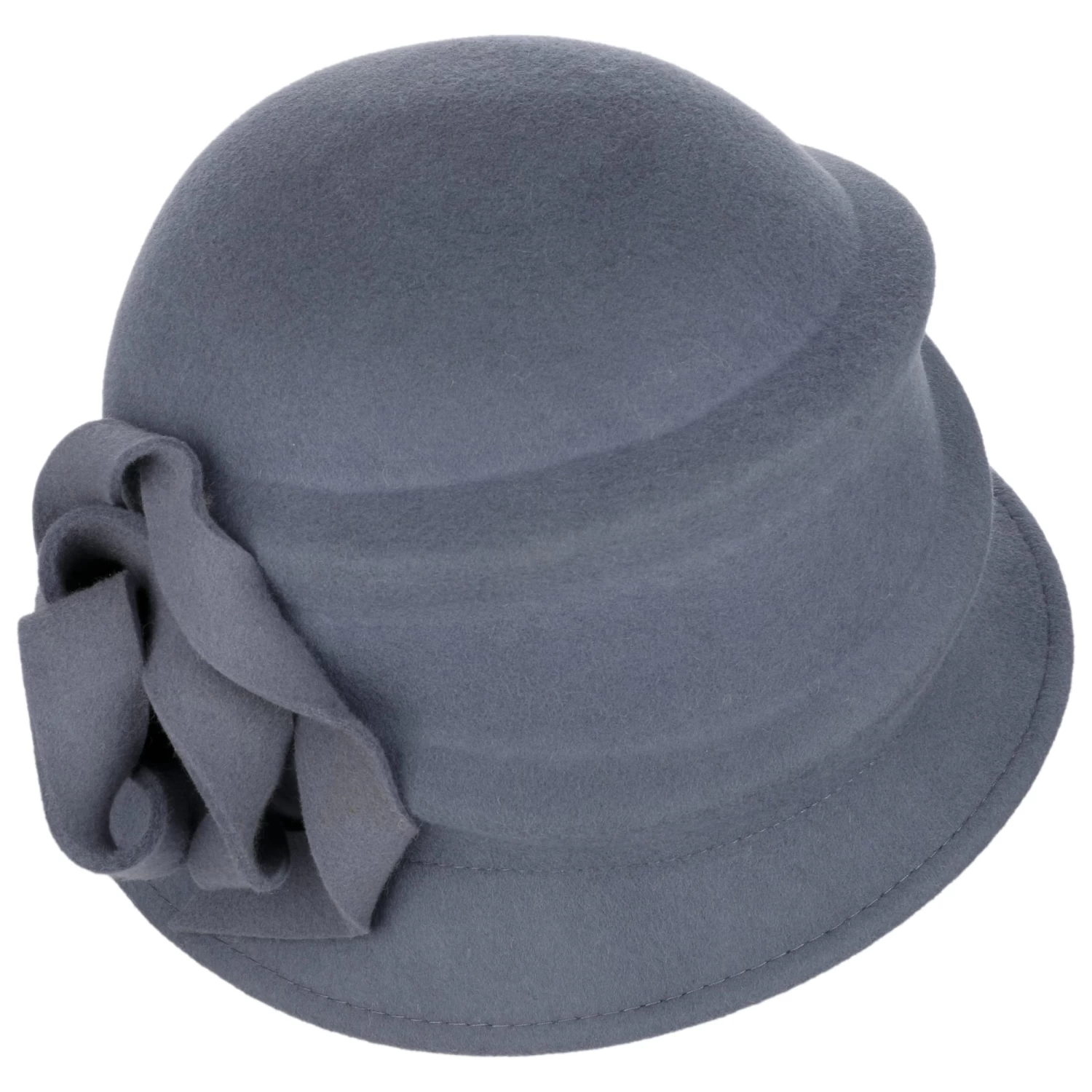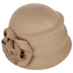 Das Material aus 100% Wolle und die aparte Formgebung des Filzhutes von Seeberger stellen eine Reminiszenz an die verspielte Damenhutmode der 20er Jahre dar, was die seitlich angebrachte Blume noch unterstreicht.