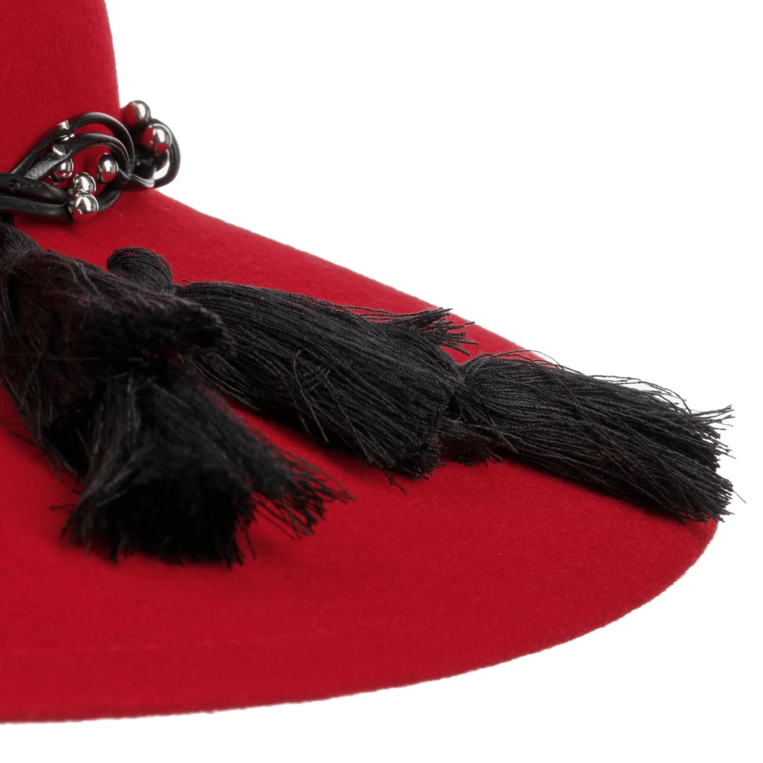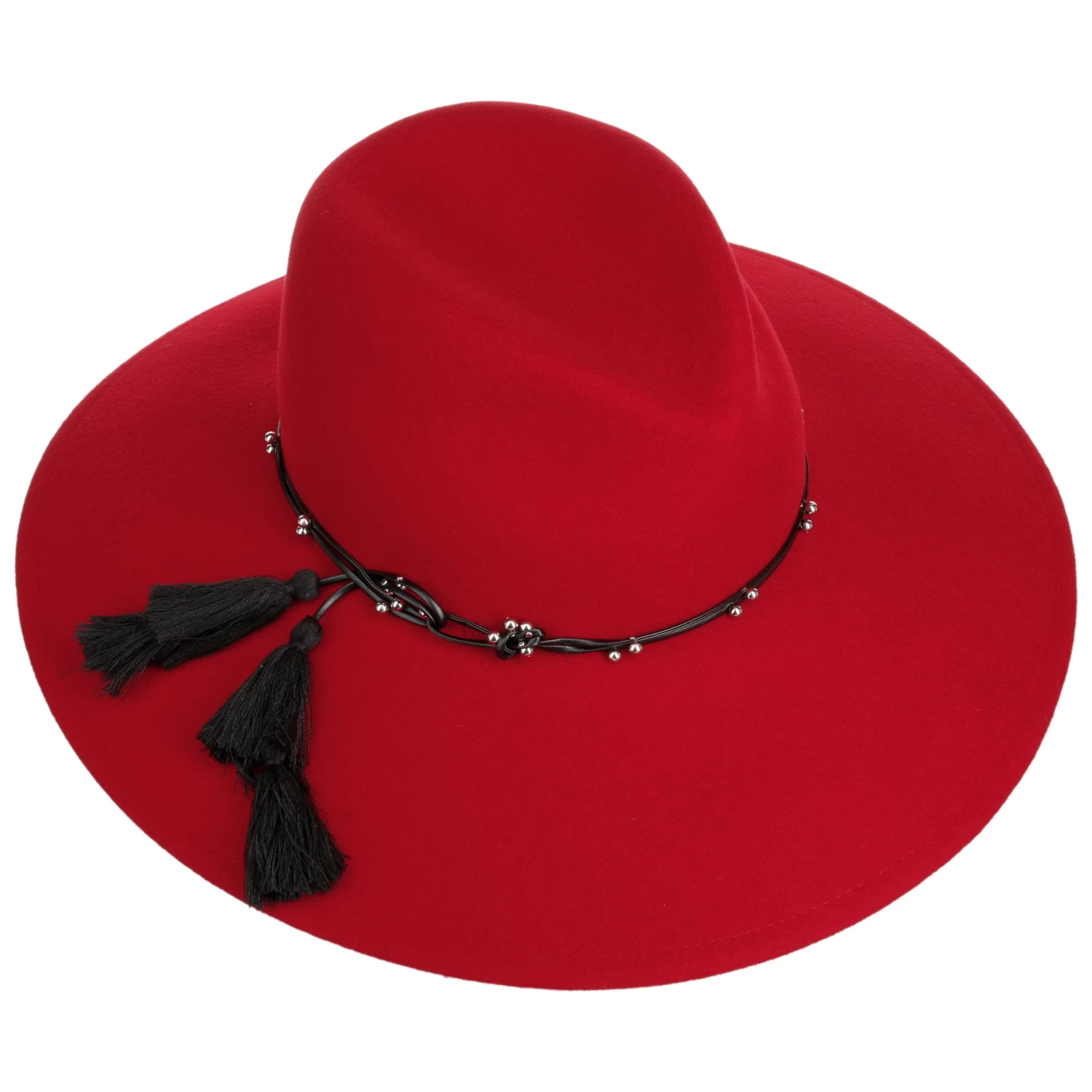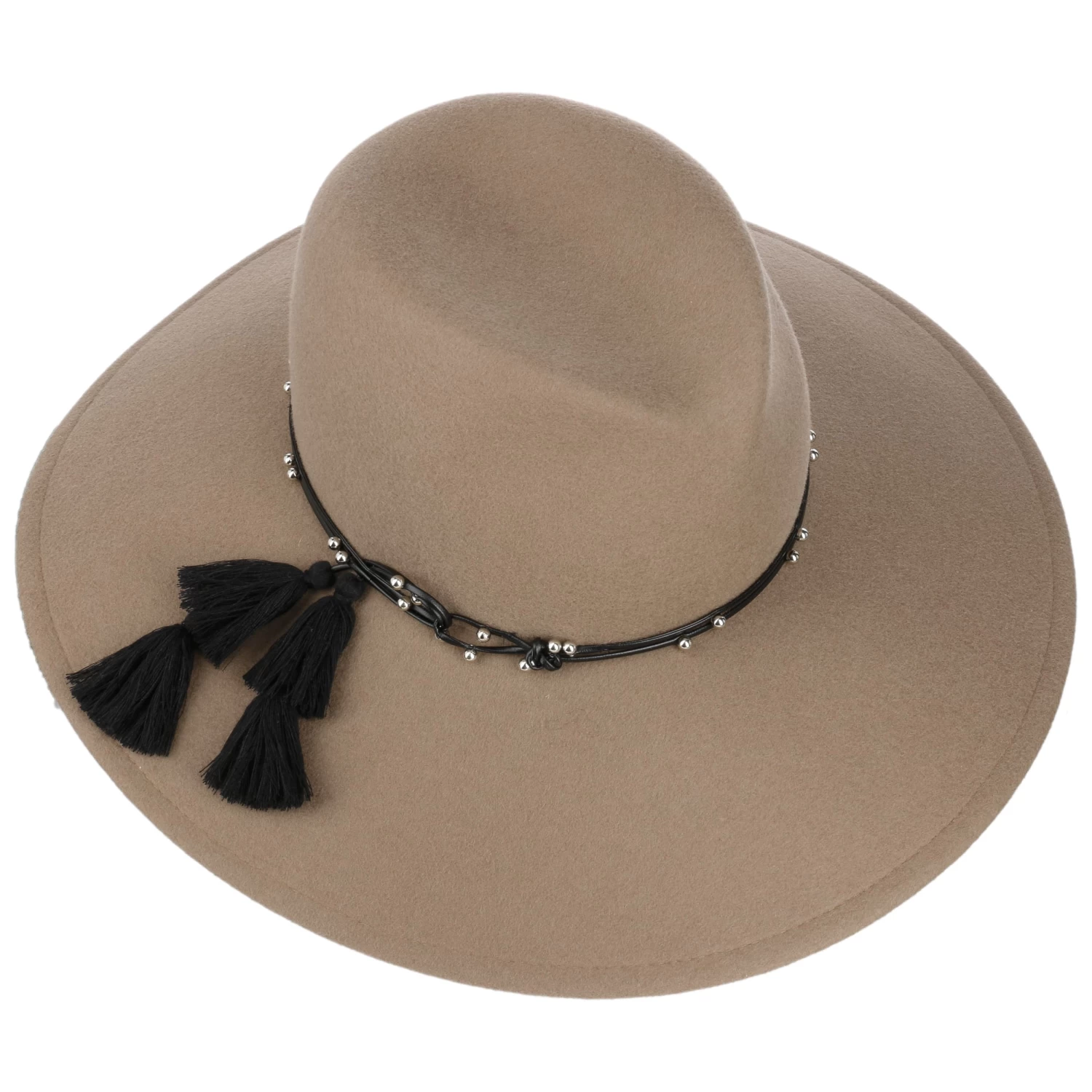 Er fällt durch seine charakteristische Form mit breiter Krempe auf. Für einen perfekten Sitz am Kopf sorgt das eingearbeitete Stretchfutterband. Ein kunstvoll verschlungenes Garniturband in Lederoptik mit vielen kleinen Schmuckperlen und zwei großen Troddeln ziert den flexiblen Reisehut.