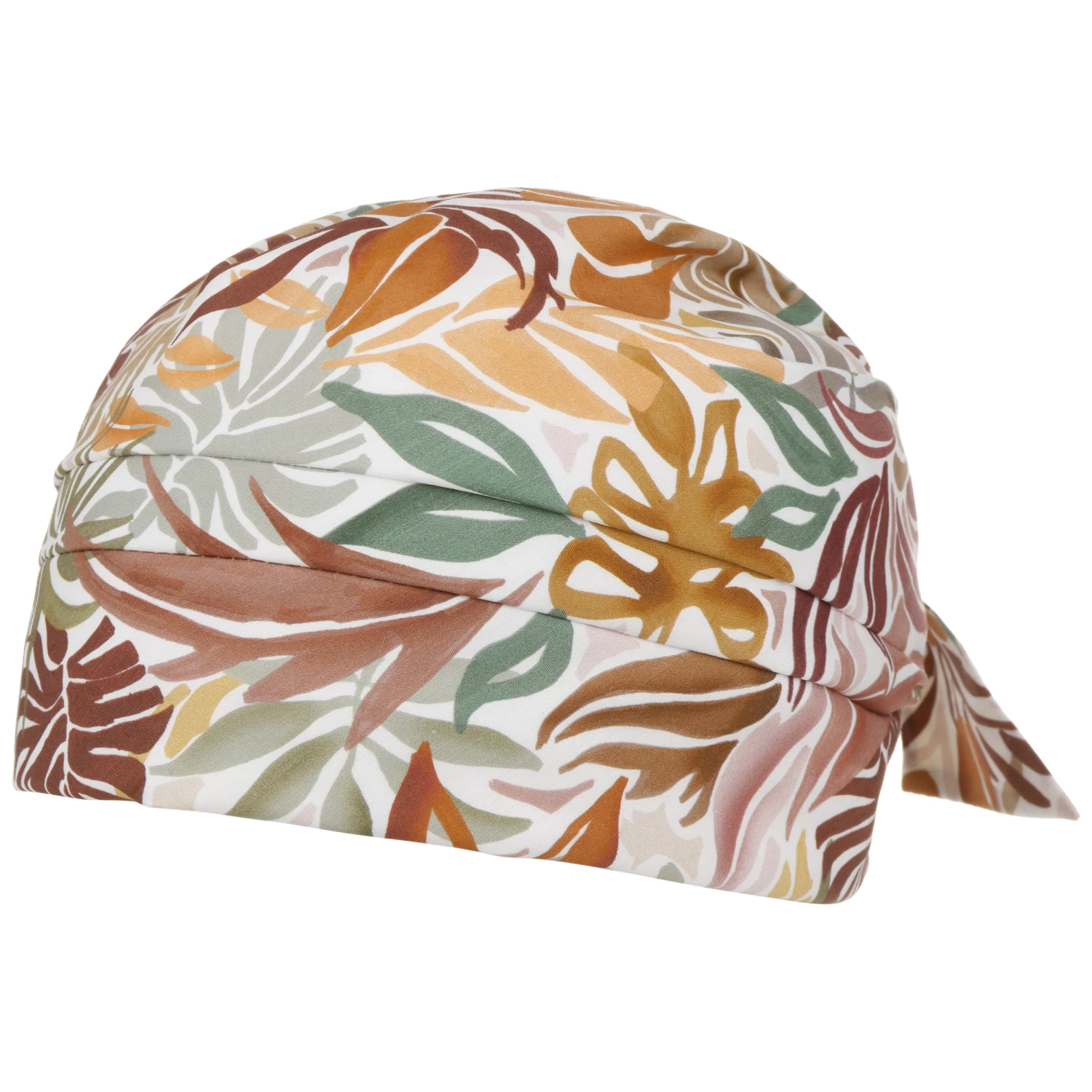 Der Druck, der sich über das gesamte Textil erstreckt, zeigt charakteristische Silhouetten unterschiedlicher Pflanzenblätter. Details wie die Schleife, die die Rückseite der aus 100% Baumwolle gefertigten Kopfbedeckung ziert, verleihen dem Design einen ansprechenden femininen Charme.