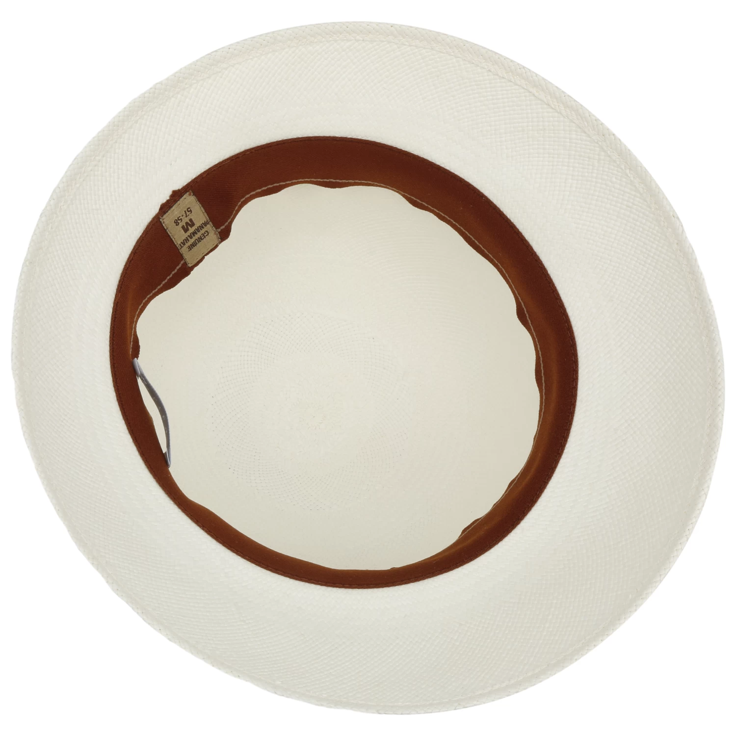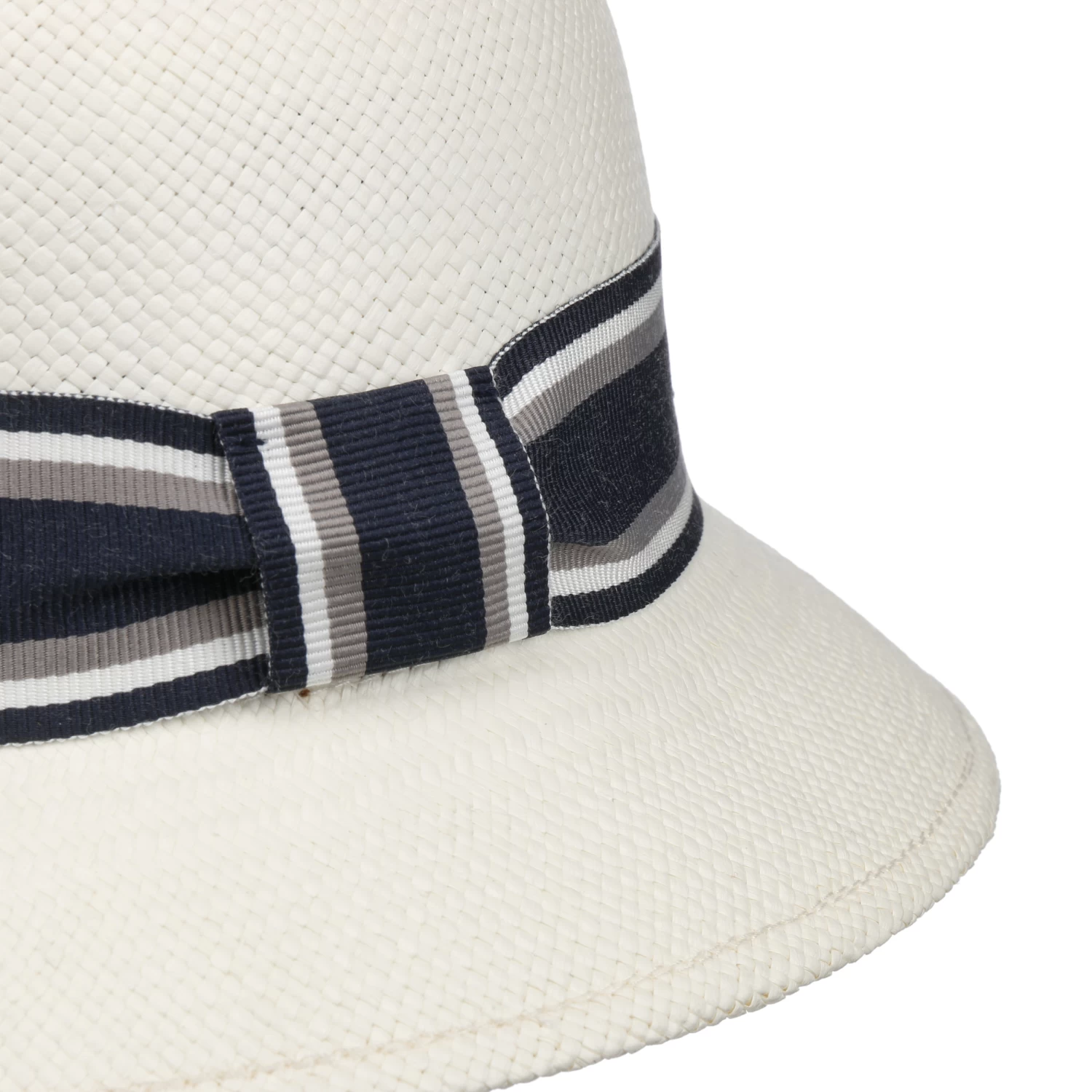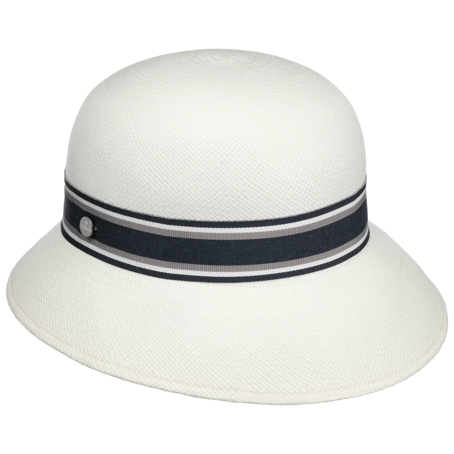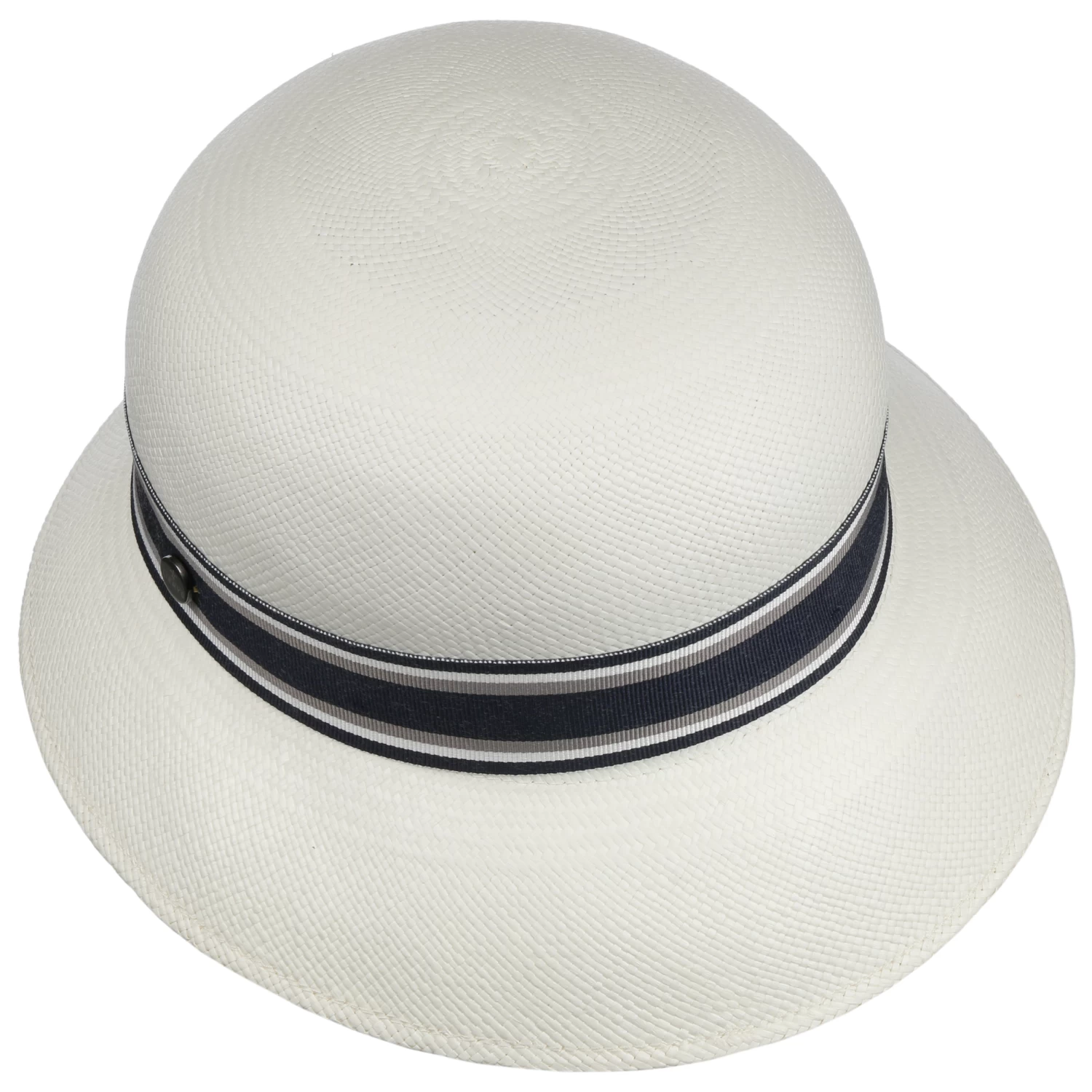 Per Hand wurde Panamastroh in Ecuador zu dem wunderschönen Glockenhut verwoben, der mit seiner vorne großzügig gestalteten Krempe, dem freundlichen unifarbenen Auftritt, ergänzt durch eine stilvoll gestreifte Ripsbandgarnitur, eine edle Ausstrahlung mitbringt.