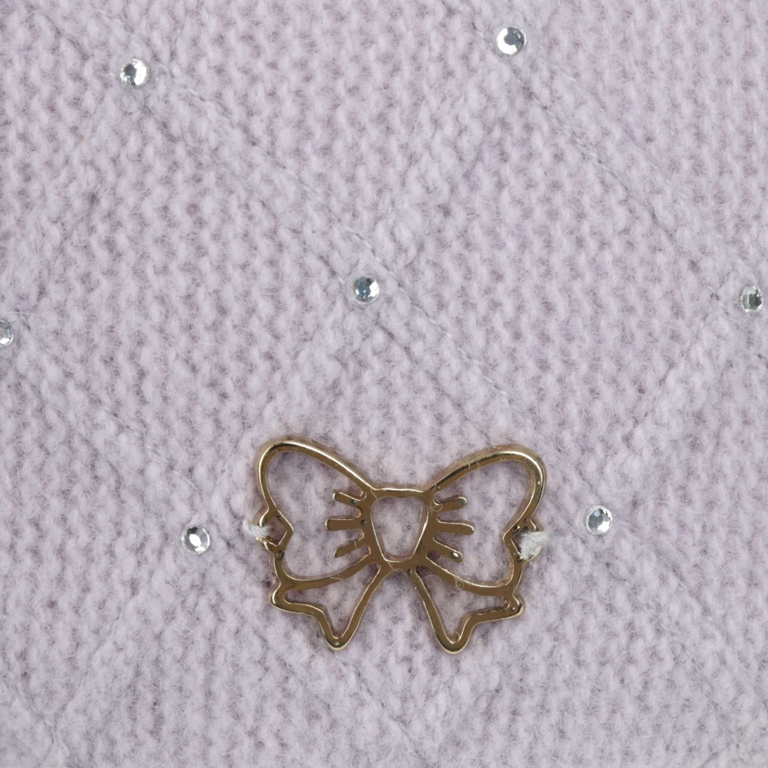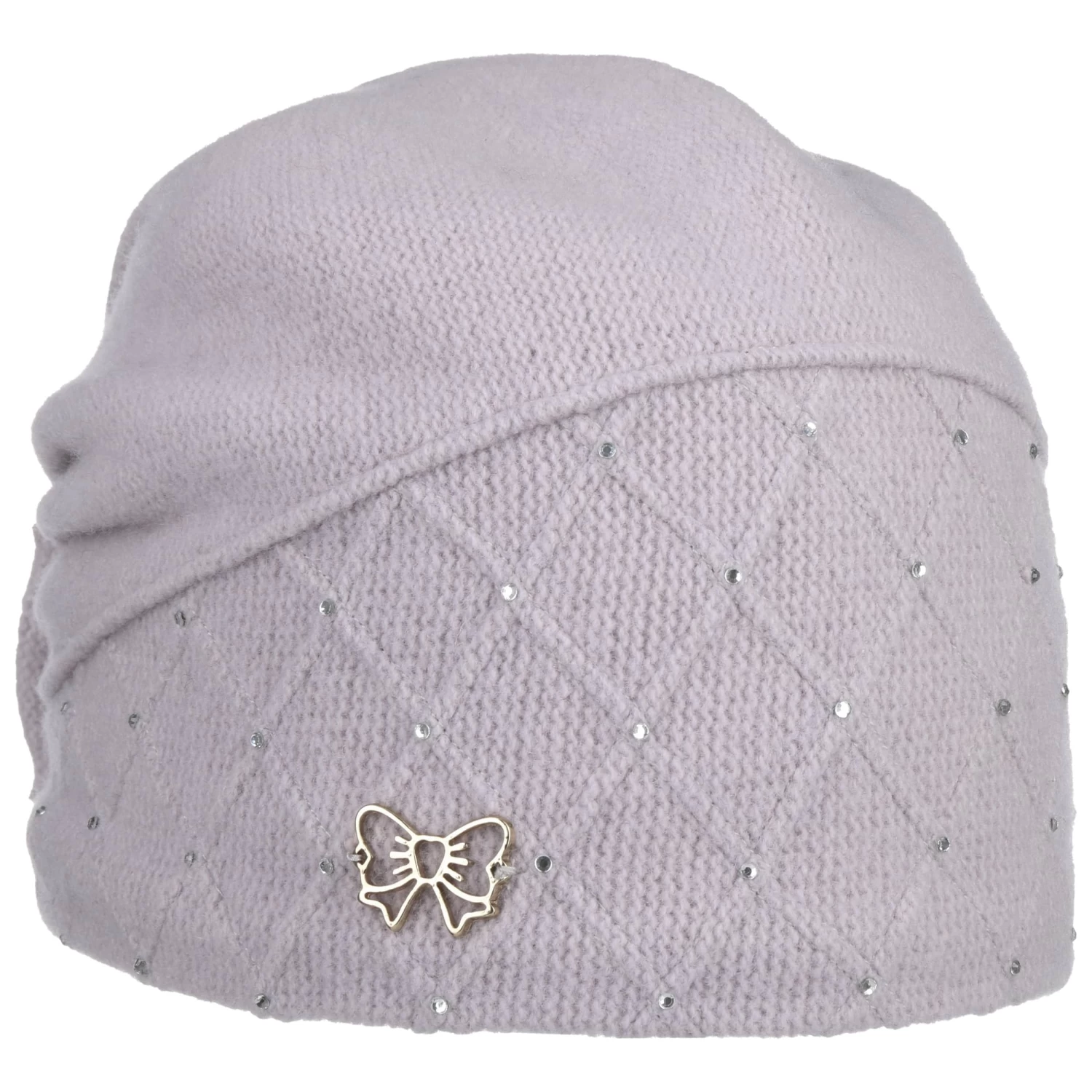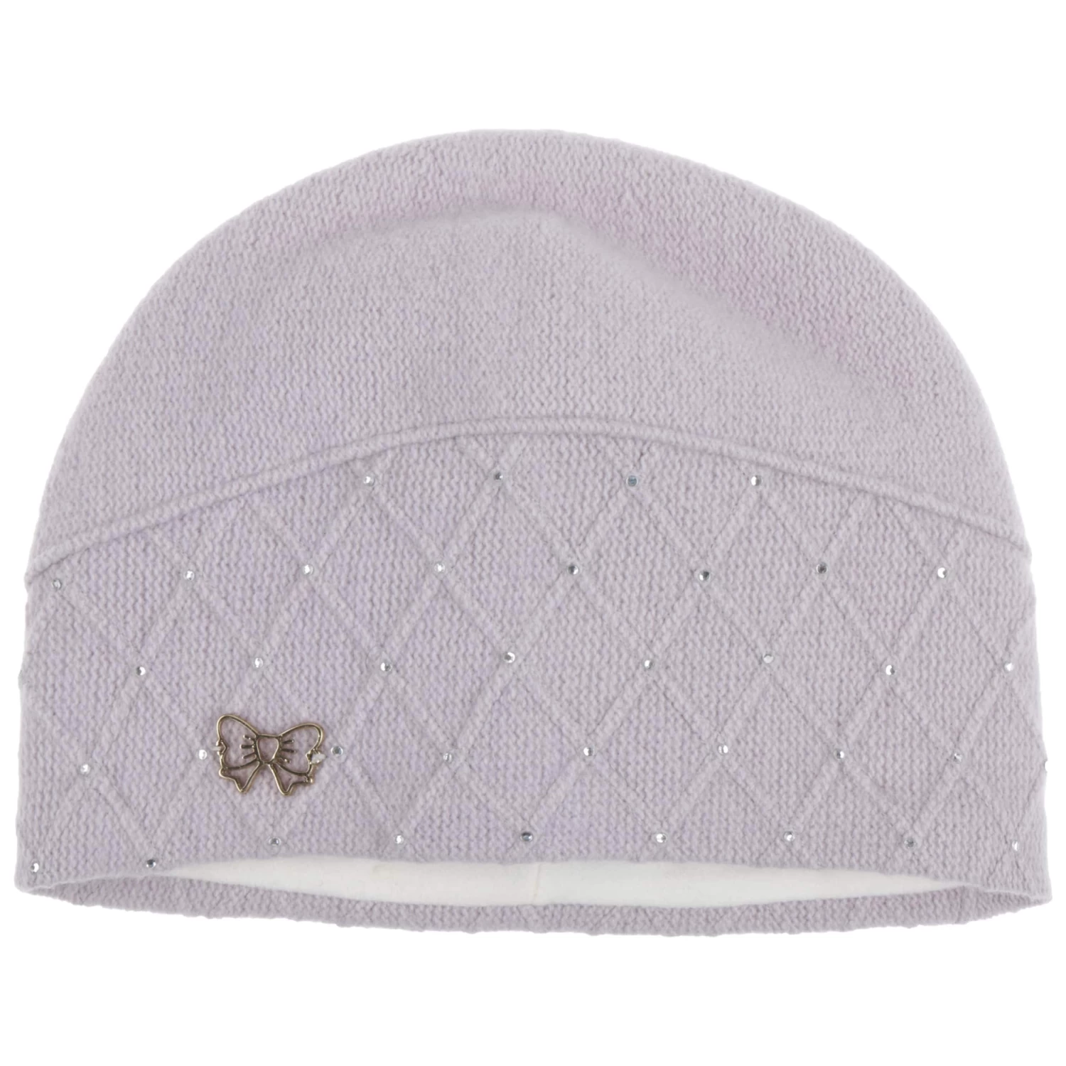 Zahlreiche Strasssteinchen zieren das raffinierte Rautenmuster, das partiell auf der Frontseite der Strickmütze zu sehen ist. Als dekoratives i-Tüpfelchen dient eine adrette Schleifenapplikation, die mit ihrem metallischen Glanz Aufmerksamkeit erregt. Ihren hohen Tragekomfort verdankt die Mädchenmütze ihrem Material aus 100% Wolle und einem angenehm weichen Futter.
