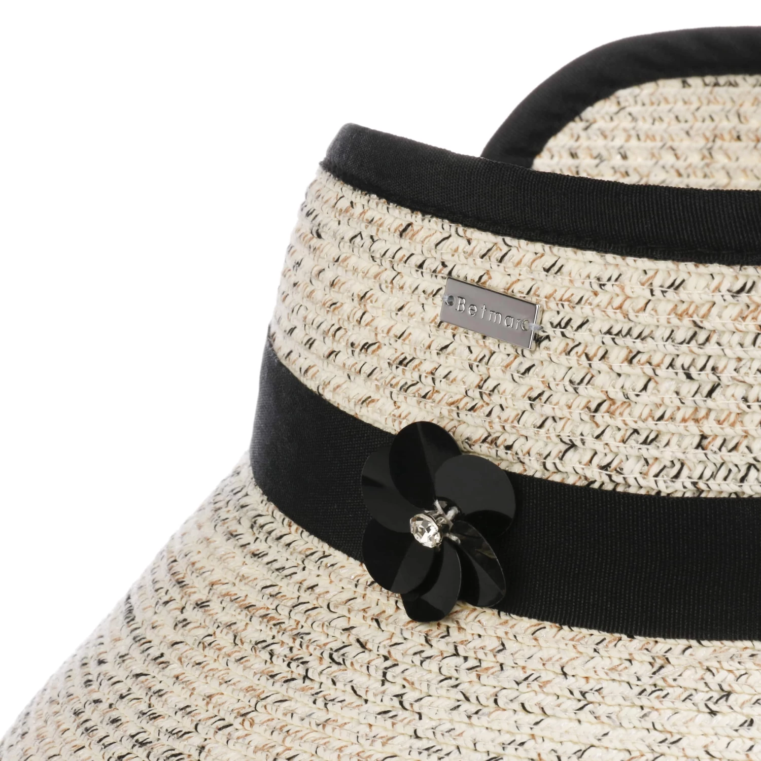 Das melierte Design wird von kontraststarkem unifarbigem Band unterbrochen. Eine dezente Blüte an der Seite dient als Blickfang. Das außergewöhnliche Accessoire schont die Frisur und schützt dabei optimal vor intensiver Sonneneinstrahlung. Ein modisches Extra für Sommerfest, Citybummel oder Straßencafé.