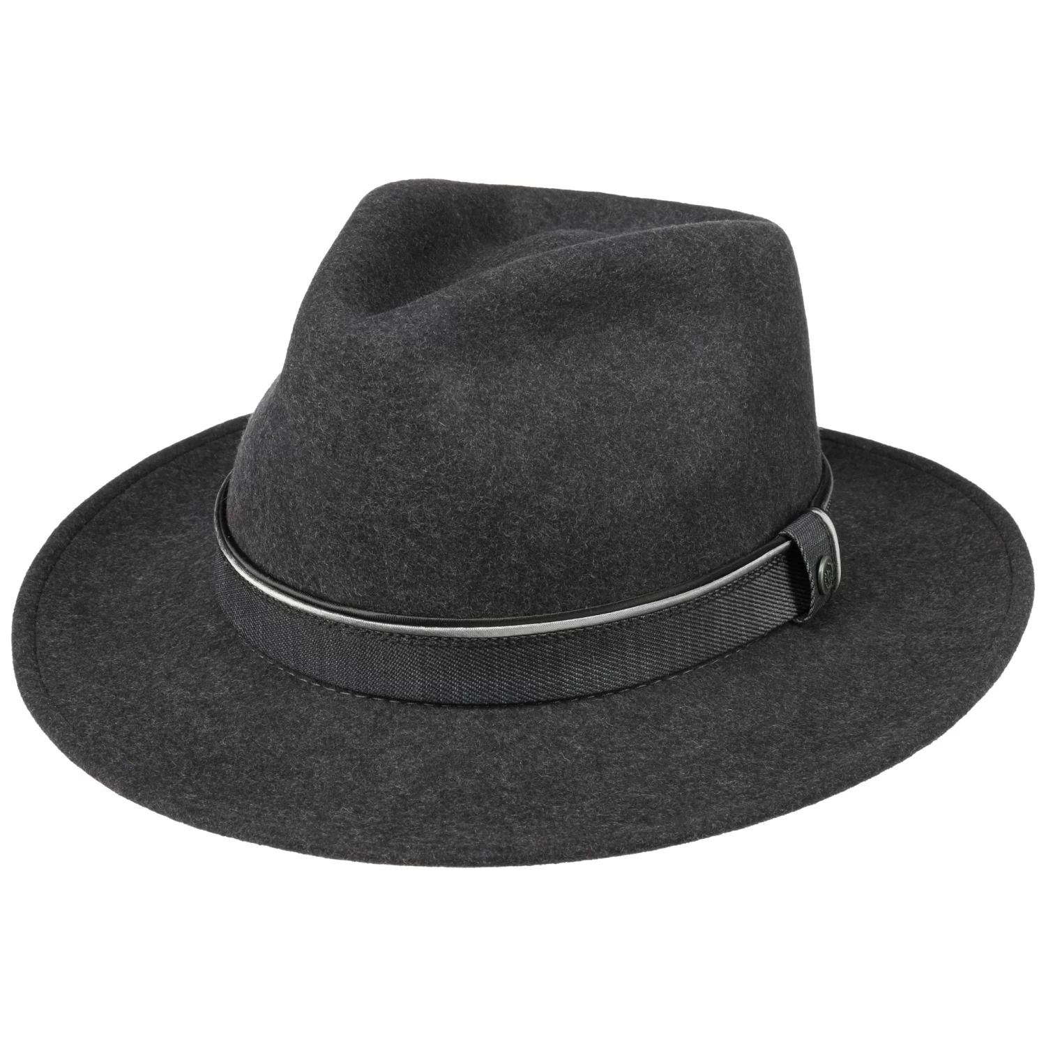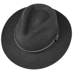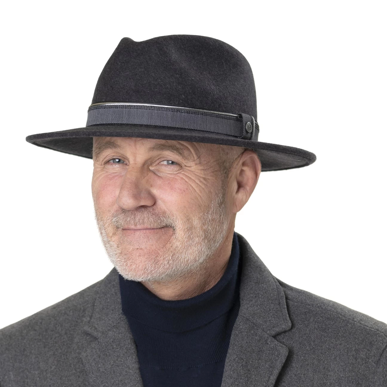 Und auch sein farblich akzentuiertes Garniturband zieht die Blicke auf sich. Das grob strukturierte Textil steht im anregenden Kontrast zum stilvollen melierten Filzmaterial, aus dem die Kopfbedeckung besteht.