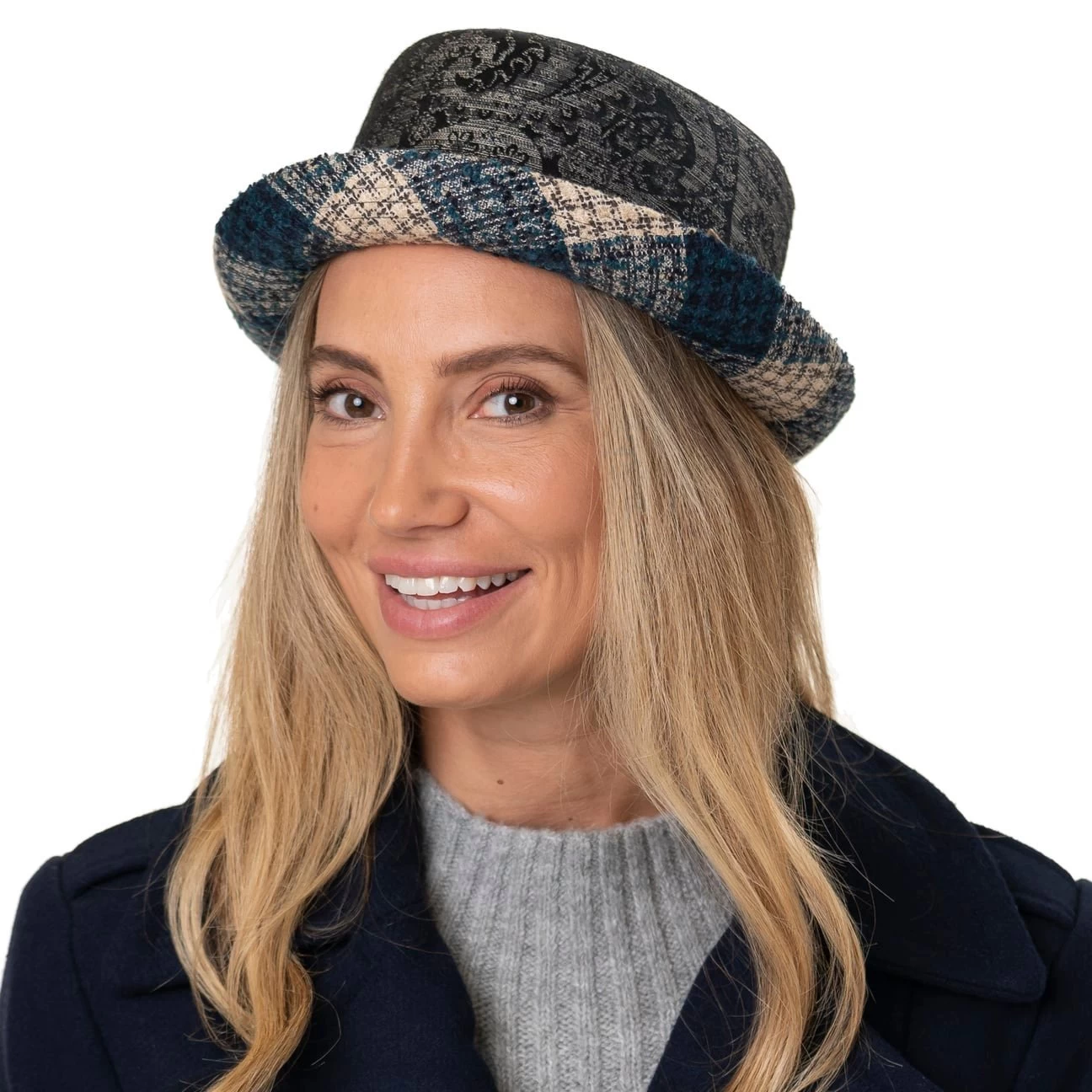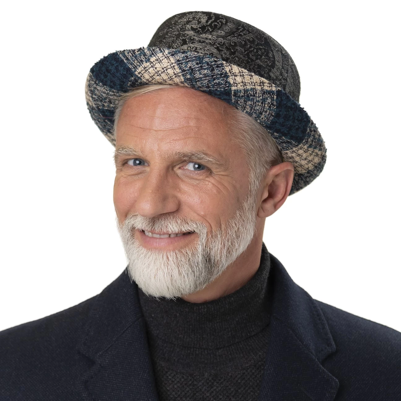 Die typische, flache Hutkrone mit Tellerbeule ziert ein elegantes Paisleymuster. Dazu bildet das Karomuster vom aufgebogenen Rand der schmalen Krempe einen dynamischen Kontrast. Das einfarbige Ripsband mit zweifarbiger Schleife rundet das exquisite Design elegant ab. Für höchsten Tragekomfort sorgt ein Baumwollfutter.