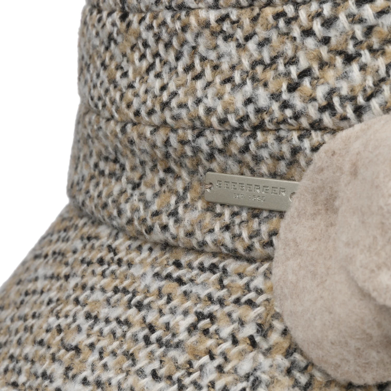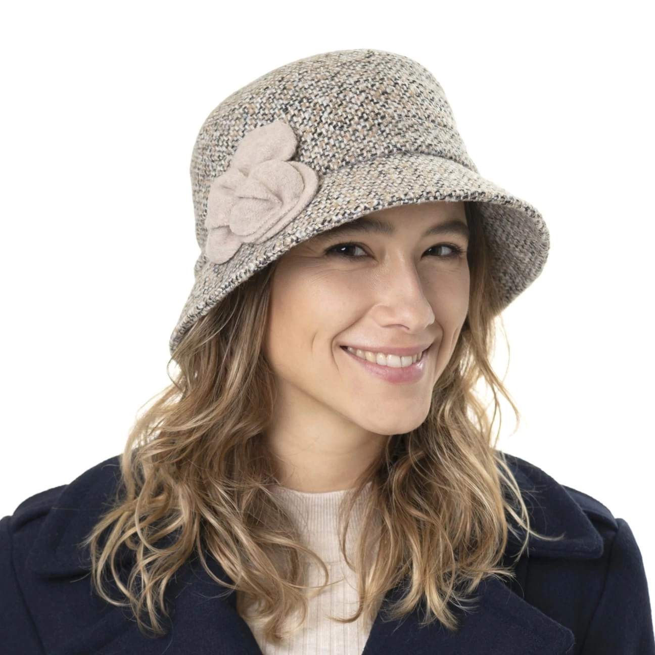 Ebenso warm wie atmungsaktiv schmiegt er sich aufs Haupt und beeindruckt dabei mit seinem mehrfarbig melierten Allover-Muster. Seine feminine Ausstrahlung verdankt der Tweedhut der seitlich angebrachten Blütenapplikation aus 100% Schurwolle.