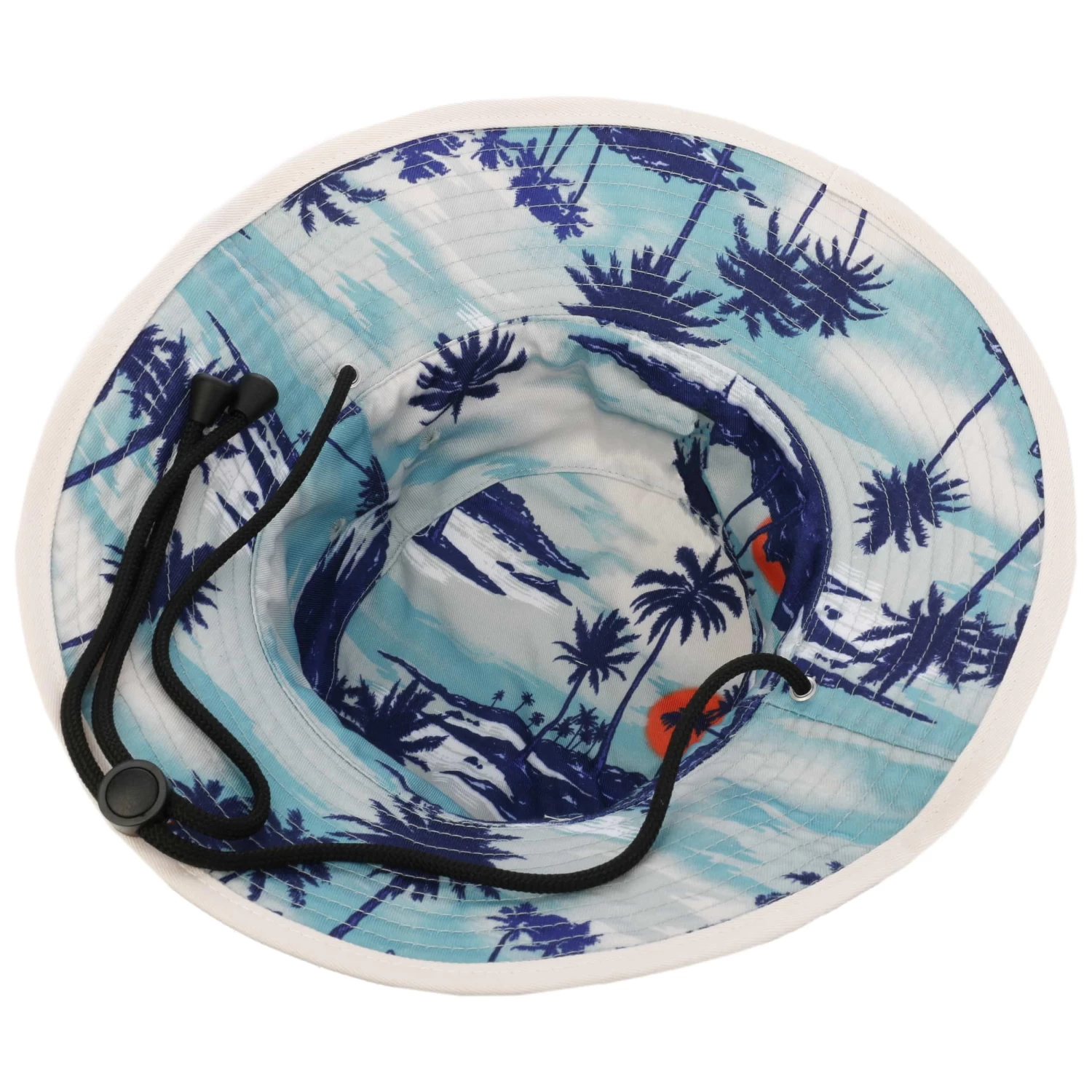 Der Wendehut ist aus griffig weicher Baumwolle und einer Baumwollmischung gefertigt und zeigt sich von der einen Seite in gut gelauntem Urlaubs- und Beach-Look, von der anderen freundlich unifarben. Dank lässigem Kinnband bleibt er auch bei dynamischeren Freizeitaktivitäten an seinem Platz.