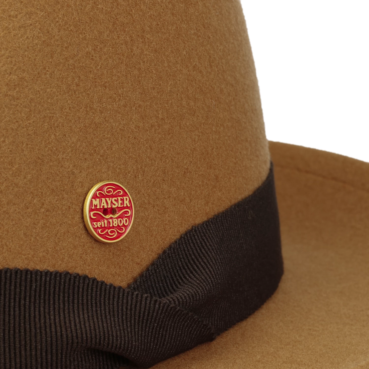 Die leicht geschwungen aufgestellte Krempe verleiht dem Filzhut einen edlen Look, der von einer Ripsbandgarnitur und dem seitlichen Markenpin gekonnt unterstrichen wird. Die elegante Garderobe erhält eine stilbewusste Vollendung, das Alltagsdress erfährt eine geschmackvolle Aufwertung.