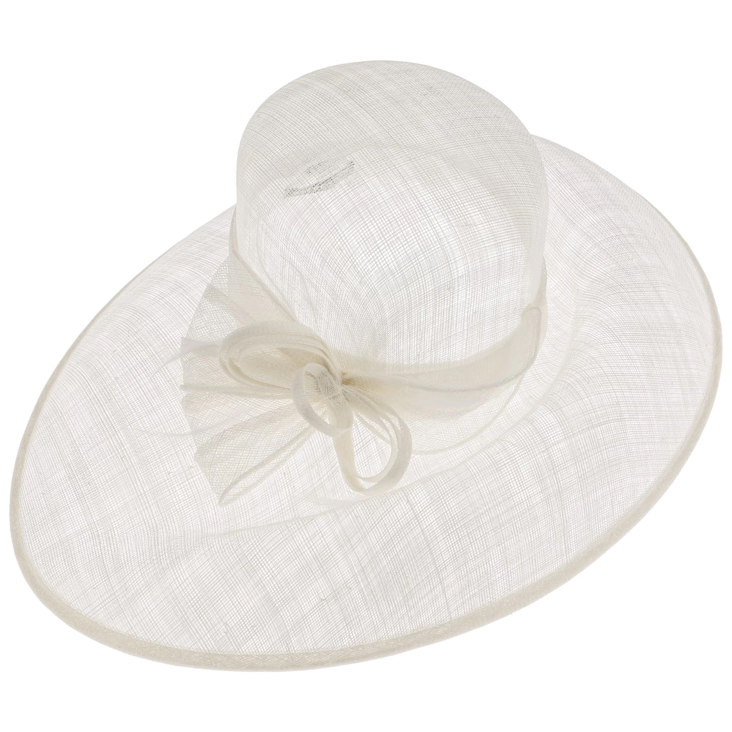 Der Hut ist aus 100% Sinamaystroh gefertigt. Luftig und leicht formt sich das feine Geflecht zur Krone und geht in eine extrabreite, elegante Krempe über. Die Garnitur mit Federn und Schleife sorgt für einen zusätzlichen Hingucker.