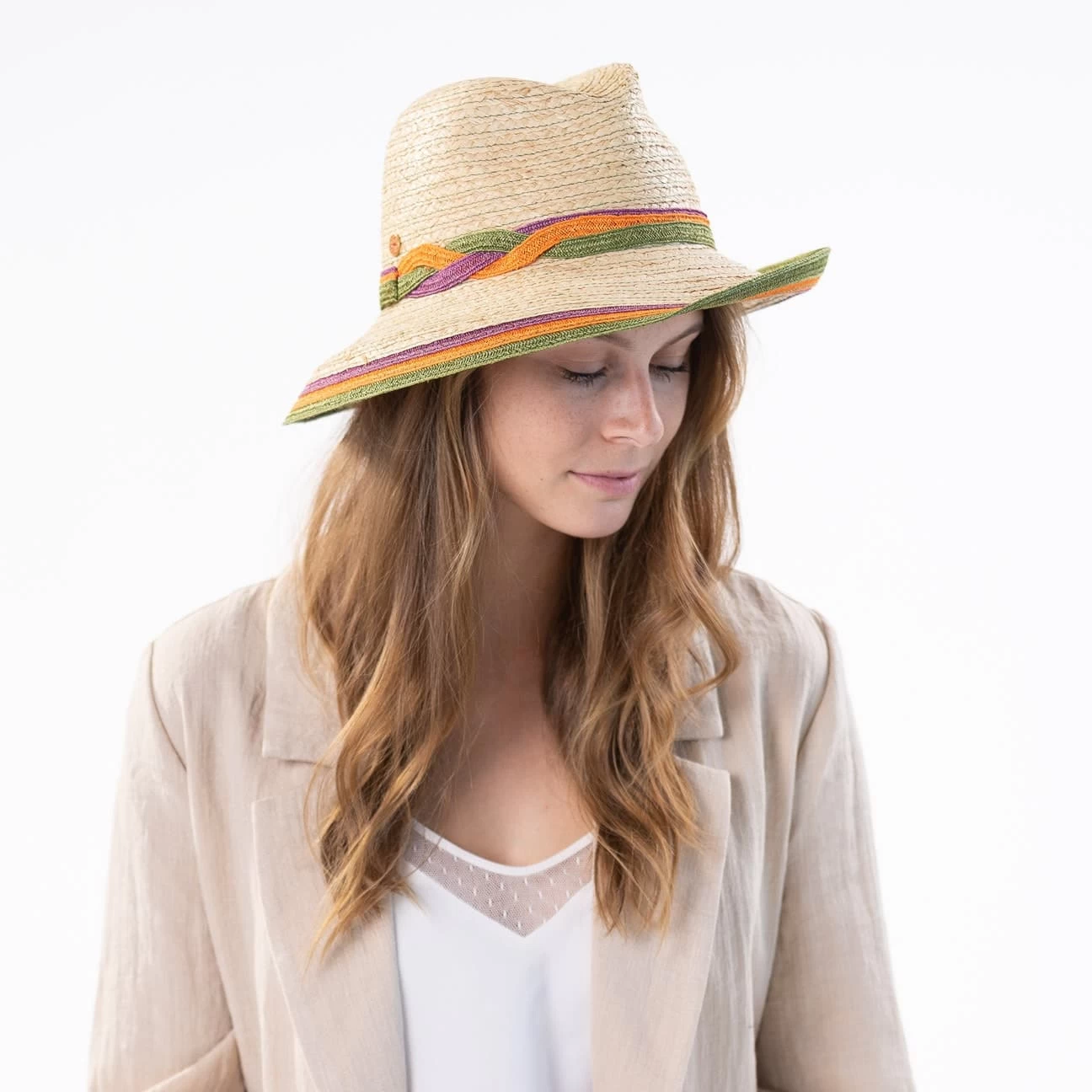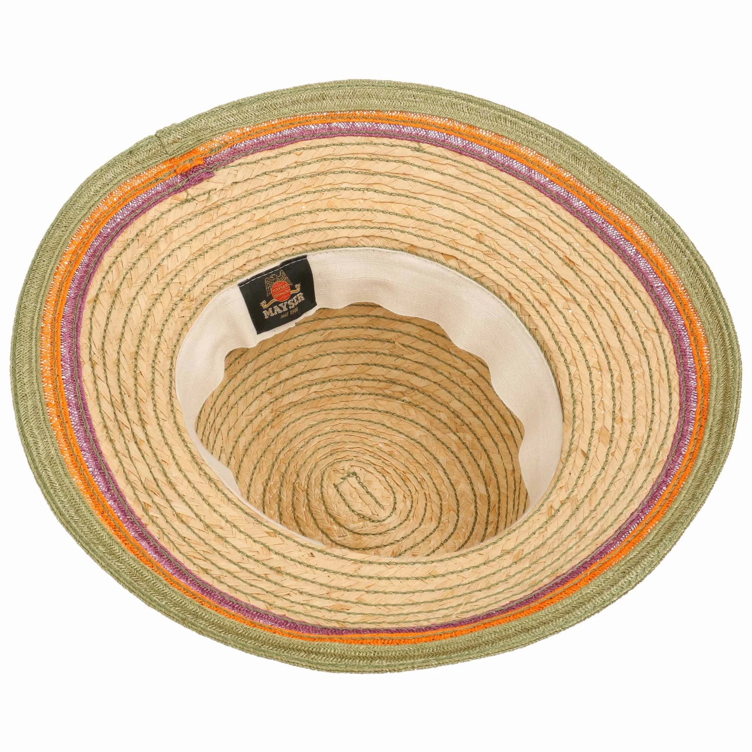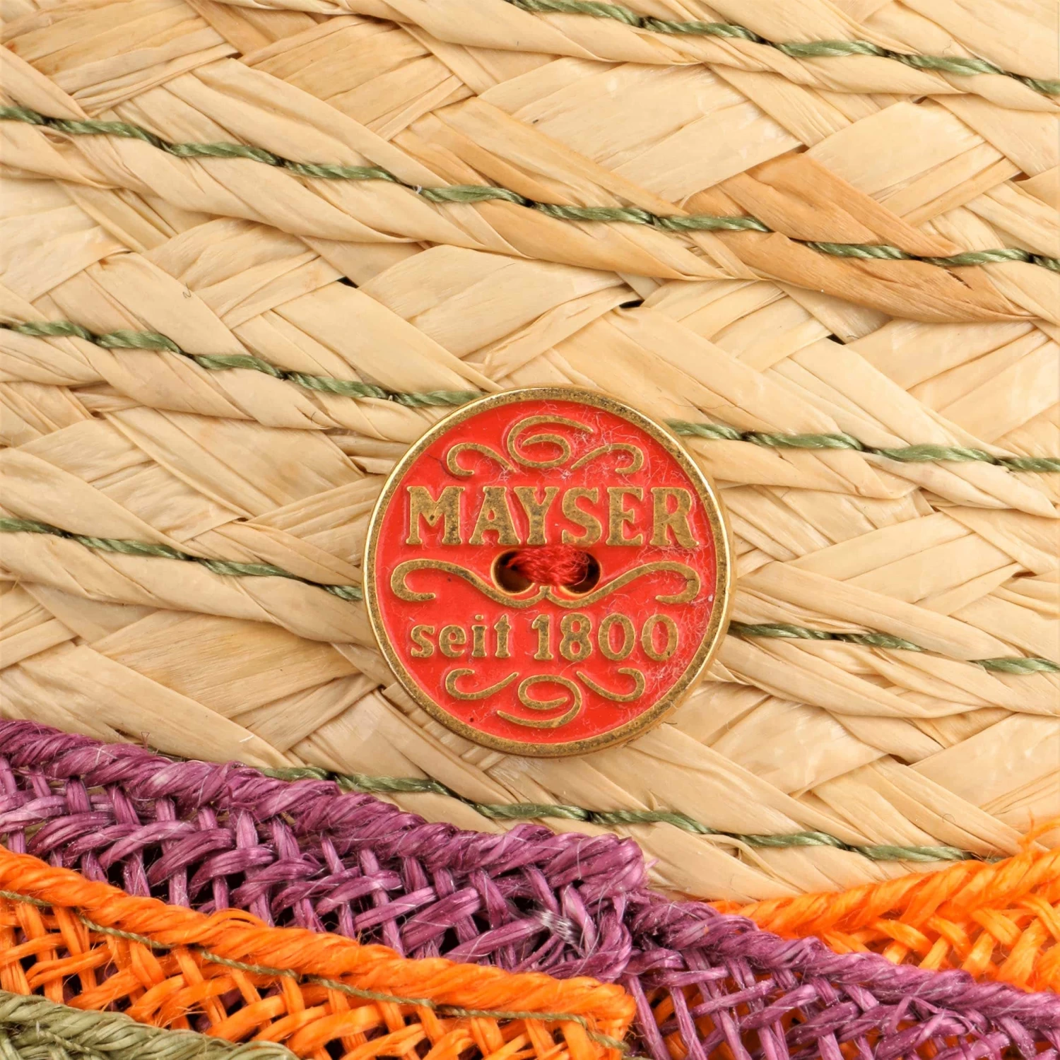 Mit seinem bunten Garniturband und den dazu passenden Stoffborten an der Krempe strahlt der Strohhut von Mayser beste Sommerlaune aus.