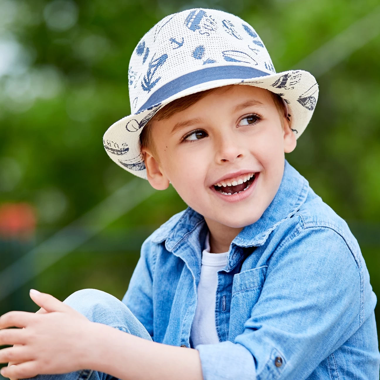 Der Sonnenhut aus 100% Papierstroh wartet mit einem luftigen Tragekomfort auf und schützt vor gefährlicher Sonnenstrahlung. Dank eines Stoffbands im Inneren umschließt der Kinderhut sanft den Kopf. Ob lässig zu Shorts und T-Shirt oder chic zu Hemd und Jeans, der gemusterte Strohhut passt immer.