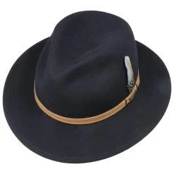 Wollfilz in VitaFelt-Qualität, aus erlesener Schurwolle gefertigt, gibt der unifarbenen Kopfbedeckung knautschbare und wasserabweisende Eigenschaften sowie schmutz- und wetterresistente Outdoortauglichkeit mit. Das stattet den Filzhut mit der schmalen Ledergarnitur und dem seitlichen Federschmuck optimal für unterwegs und die Teilnahme an gehobenen Freizeitanlässen aus.
