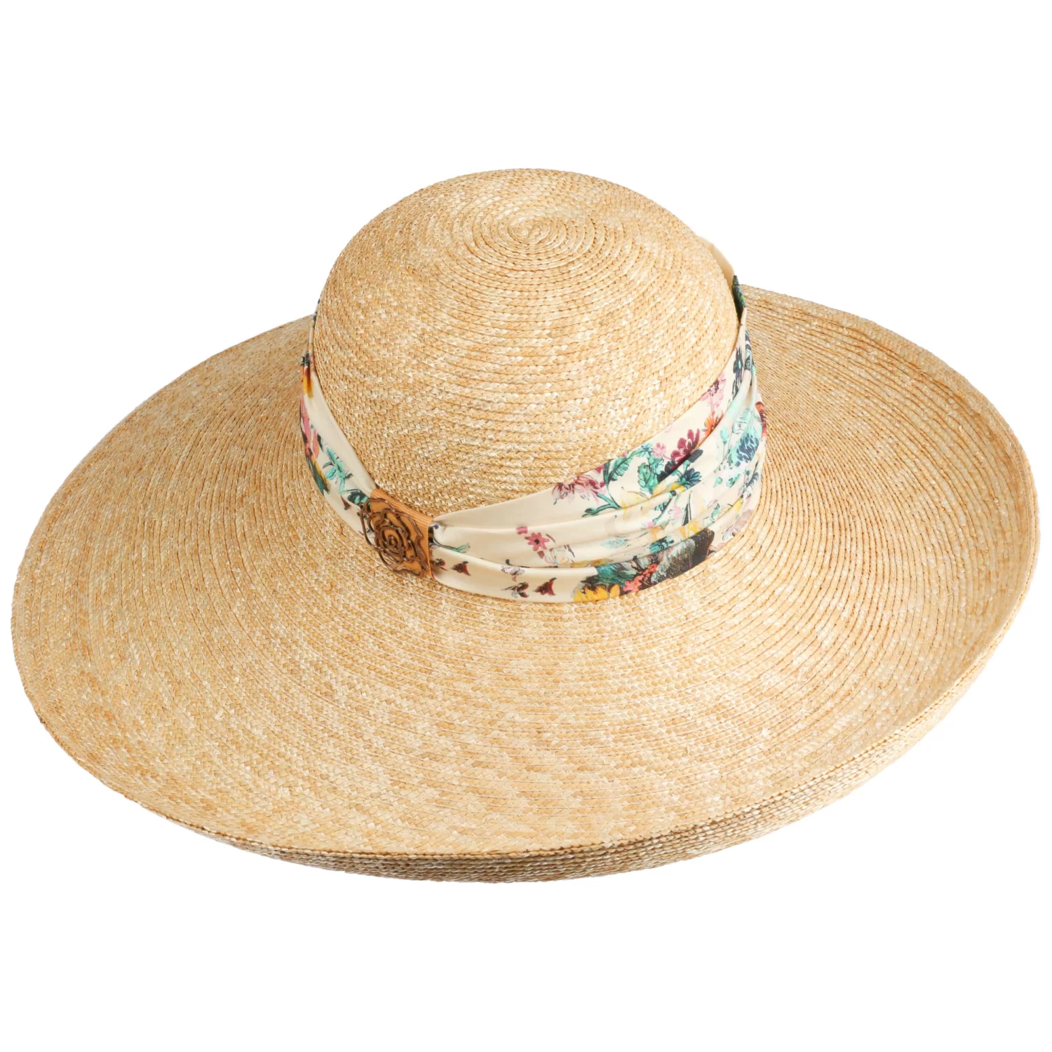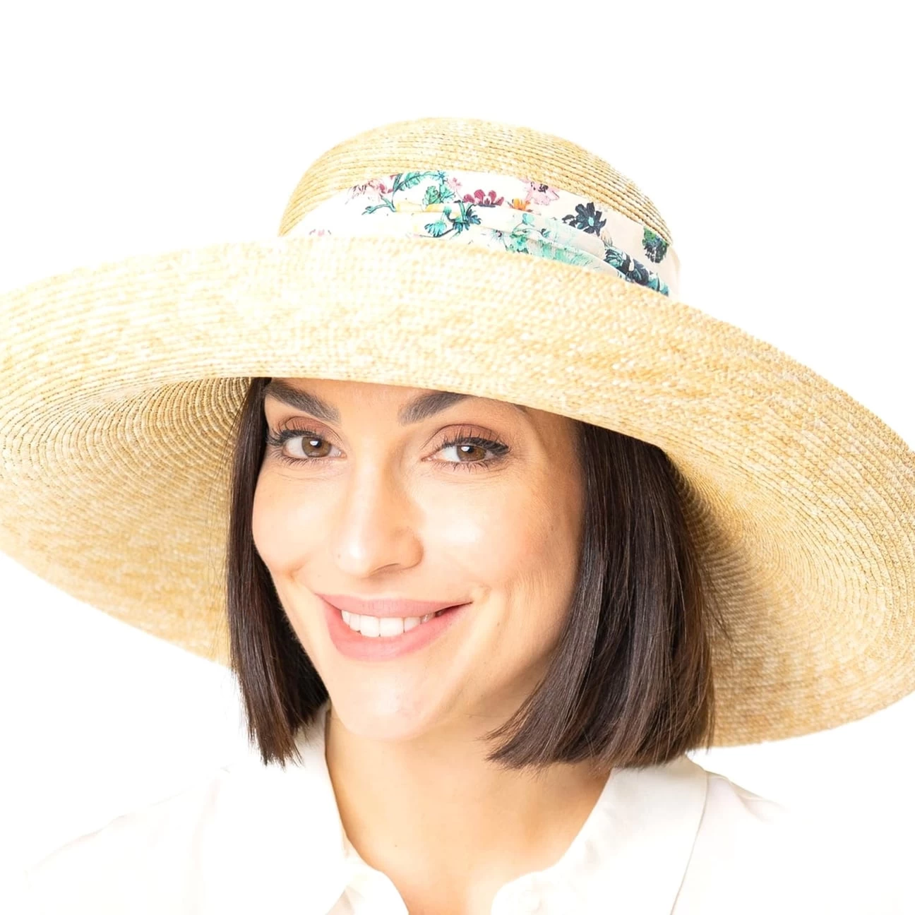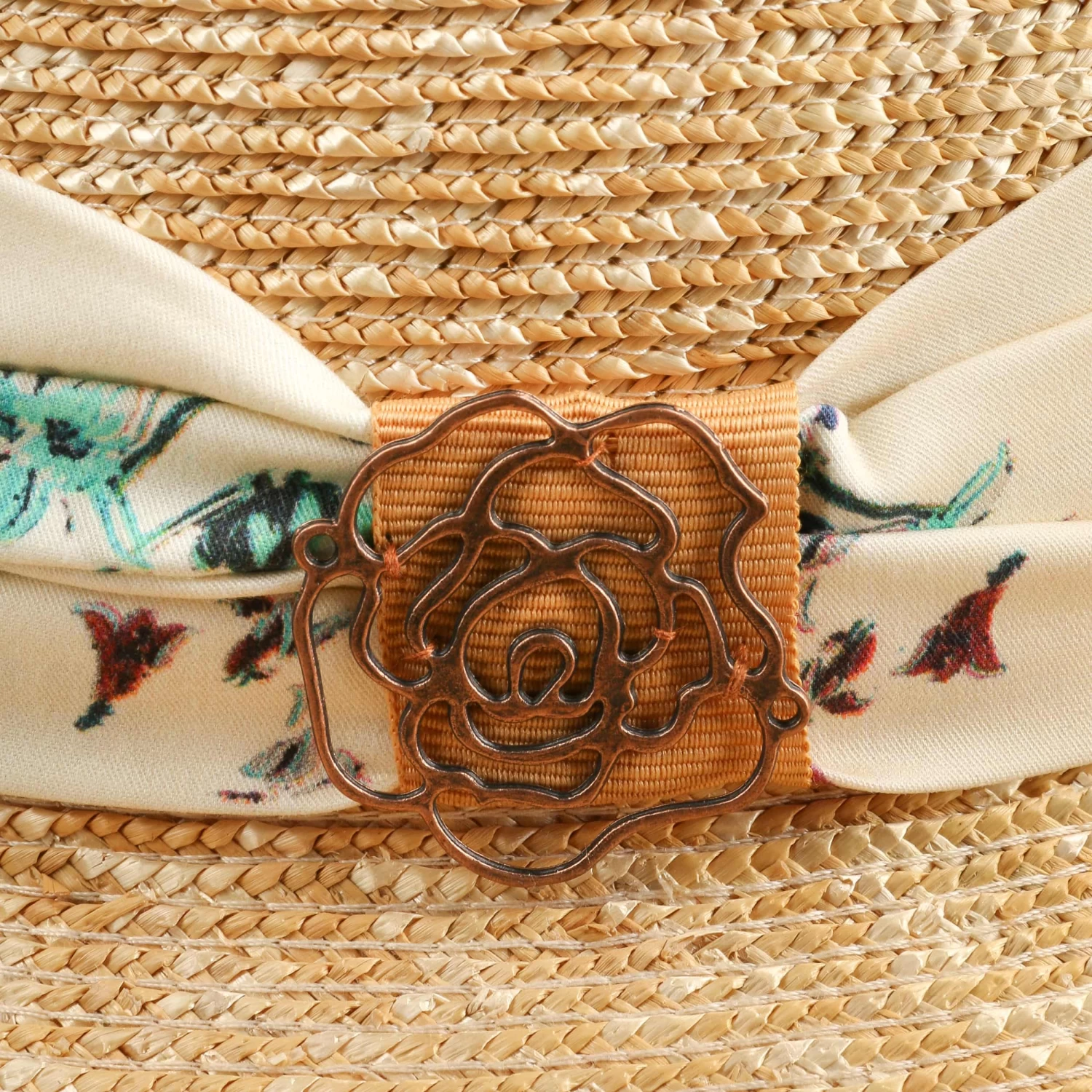 Als Highlight präsentiert sich die betont breite Krempe, die, wie auch der Kopfteil, aus 100% feinem Weizenstroh gefertigt ist. Sie ist partiell schwungvoll nach oben geschlagen. Ein mehrfarbig bedrucktes Garniturband, das von einer Metallblüte dekoriert ist, rundet den sommerlichen Look optimal ab.