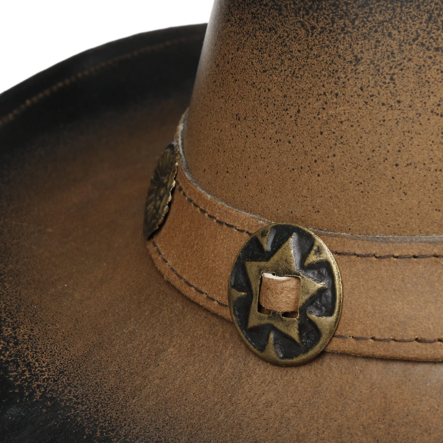 Der robuste Cowboyhut besticht durch die ovalen, metallenen Antik-Conchos, welche an der Ledergarnitur befestigt sind.