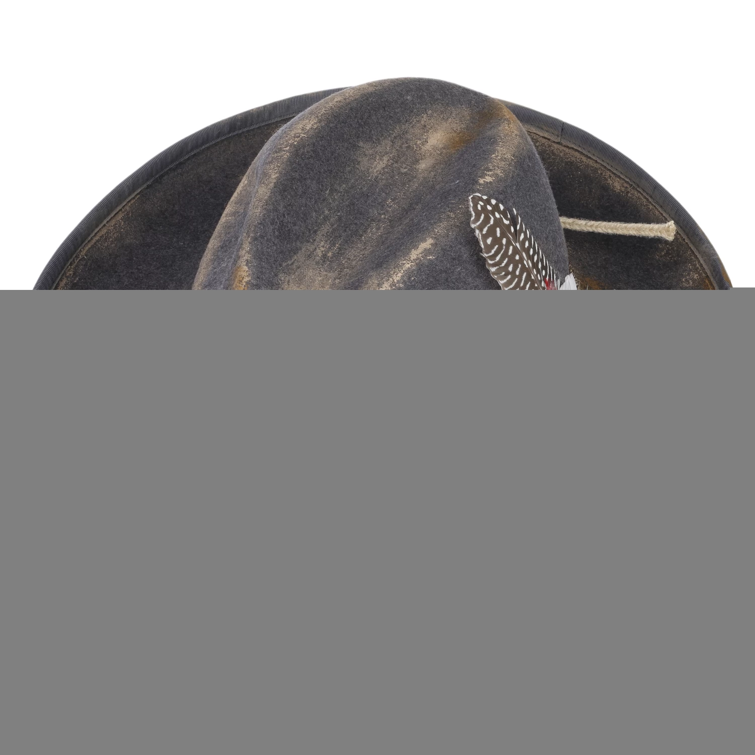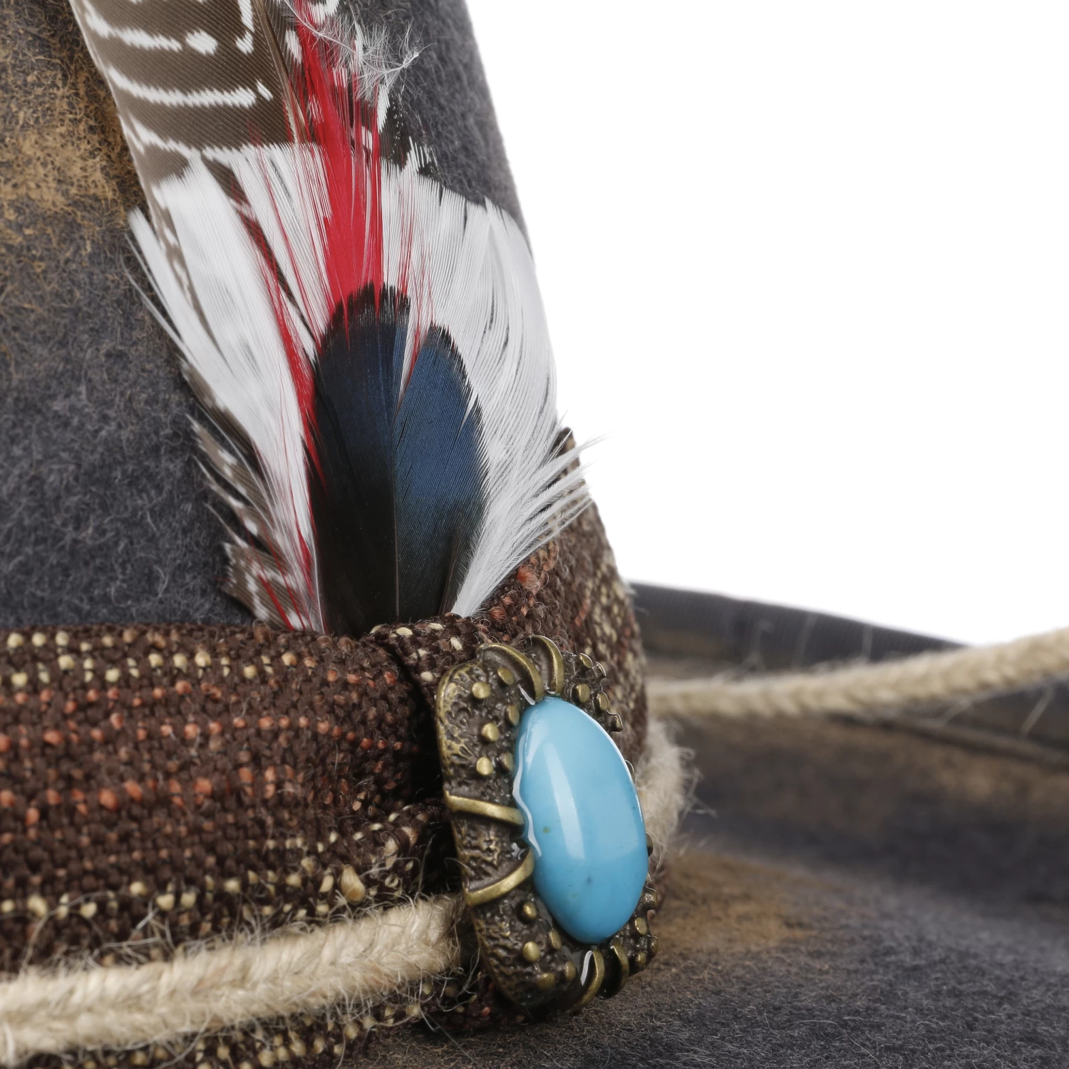 Das Allover-Muster mit Vintage-Flair, das breite Hutband mit türkisfarbenem Knopf und die seitlich eingesteckte Feder machen ihn zum markanten Blickfang. 100% gefilzte Wolle stattet den Outdoorhut mit wasserabweisenden Eigenschaften aus. So kommt das extravagante Design bei jedem Wetter zur Geltung.