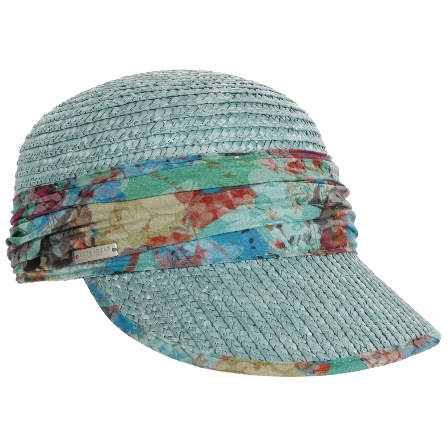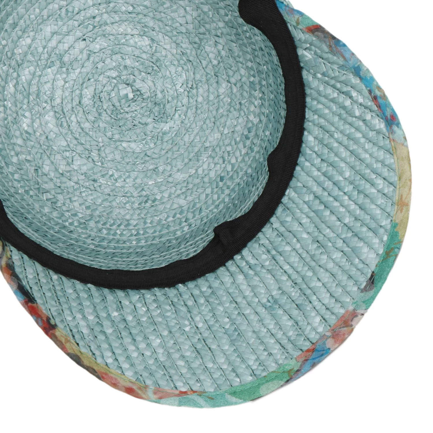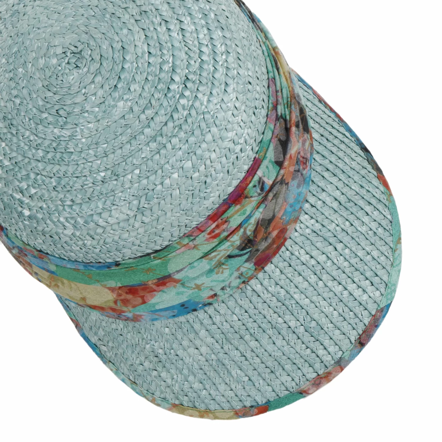 Der große Schirm aus 100% Stroh spendet dem Gesicht angenehmen Schatten. Zum Blickfang wird die Cap dank des floral gemusterten Stoffbands mit Baumwollanteil – ein Muster, das sich auch im Schirmeinfass wiederfindet.