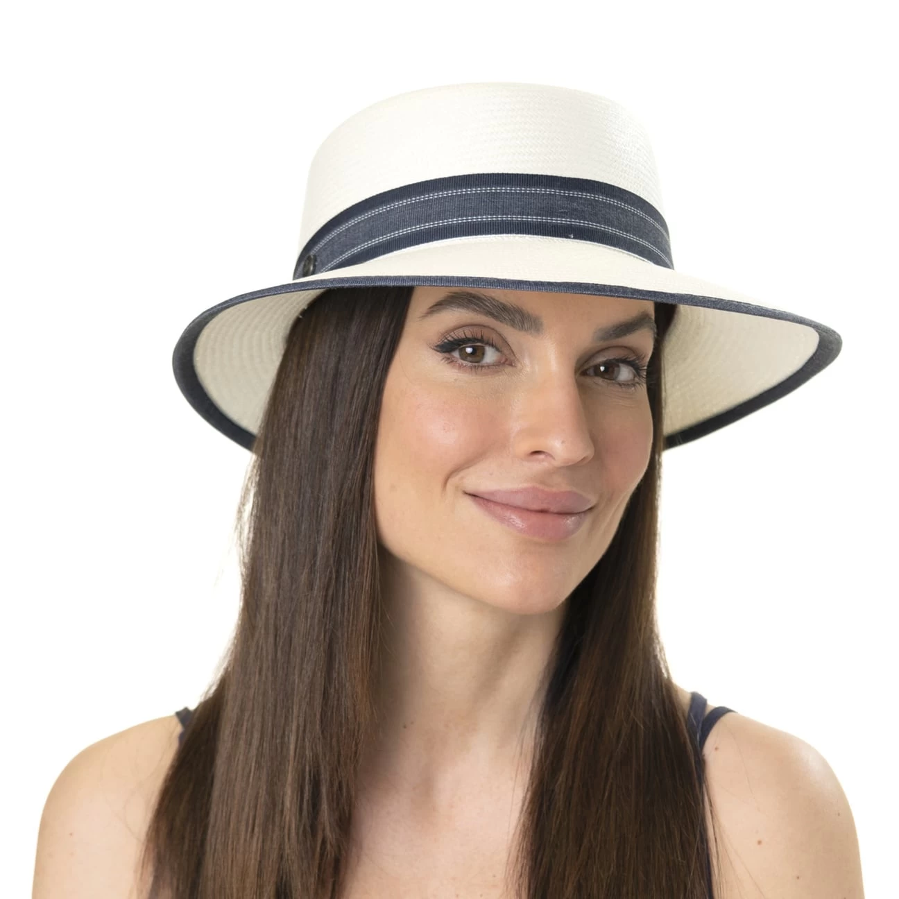 Mit viel Liebe zum Detail ist er aufwendig von Hand gefertigt. Einen sommerlichen Kontrast bilden das einfarbige Ripsband mit Ziernähten und Markenpin sowie der farblich abgesetzte Rand der breiten Krempe. Damit verleiht der lässige Sonnenhut jedem Outfit eine lockere Eleganz.