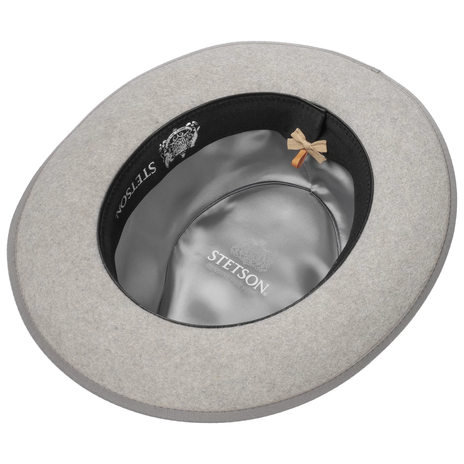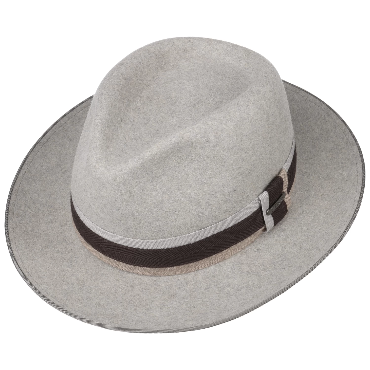 Davon setzt sich eine Einfassung um die Krempe farblich ab und eine gestreifte Ripsbandgarnitur mit Markenemblem vollendet den handgefertigten Filzhut geschmackvoll. Stattlich behütet er den ihm anvertrauten Kopf, der den zusätzlichen Komfort von anschmiegsamem Stofffutter genießt.