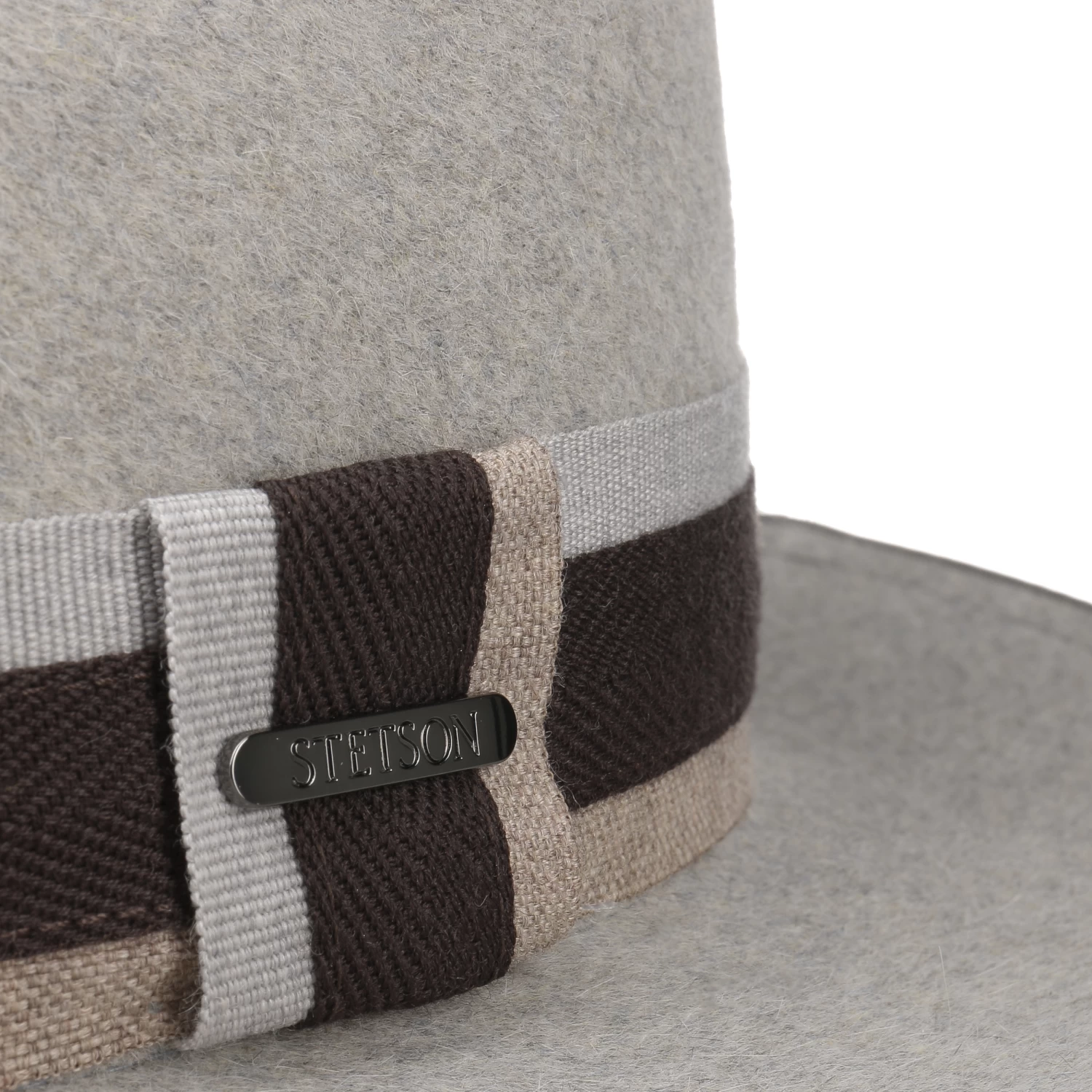 Stetsons Materialwahl für den Fedora fiel auf geschmeidiges Haarfilz, das sich in elegantem meliertem Erscheinungsbild zeigt.
